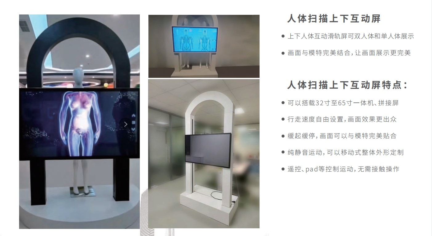 滑軌互動(dòng)屏又稱(chēng)滑軌電視,由軌道、電子顯示屏幕、紅外感應(yīng)器、燈箱、主機(jī)等組成,可以上下左右控制顯示屏,當(dāng)電子屏幕移動(dòng)到預(yù)定點(diǎn)位時(shí),將自動(dòng)播放該部分的視頻內(nèi)容并與觀(guān)眾產(chǎn)生互動(dòng)。顯示屏可以選擇LED、透明屏、拼接屏等不同顯示設(shè)備,根據(jù)客戶(hù)需要定制。圖像根據(jù)手指的動(dòng)作進(jìn)行放大、縮小、旋轉(zhuǎn)等,同時(shí)還可以自動(dòng)巡航。智能滑軌互動(dòng)屏就是可以在軌道上滑行的顯示屏幕。